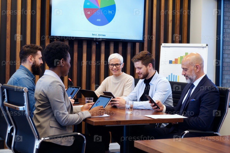 Разнообразная группа взрослых профессионалов, сотрудничающих во время деловой встречи