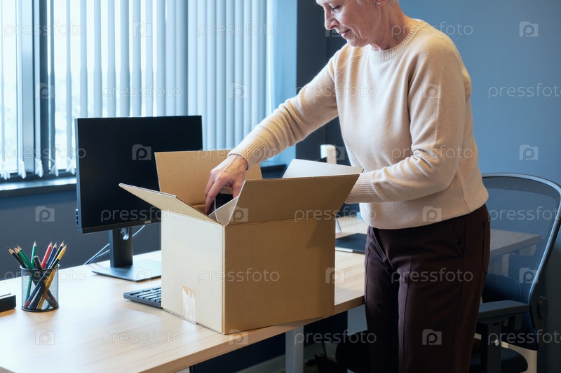 Старшая женщина упаковывает картонную коробку в современном офисном рабочем пространстве