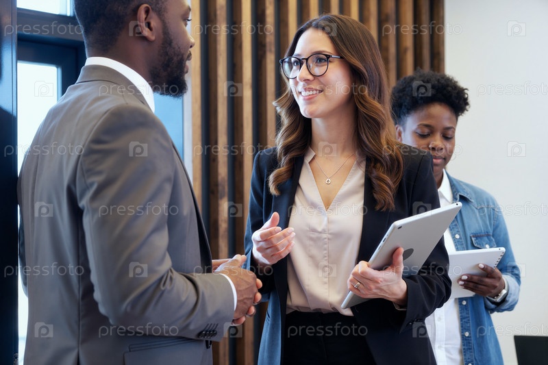 Молодая женщина обсуждает бизнес-стратегию с чернокожими коллегами