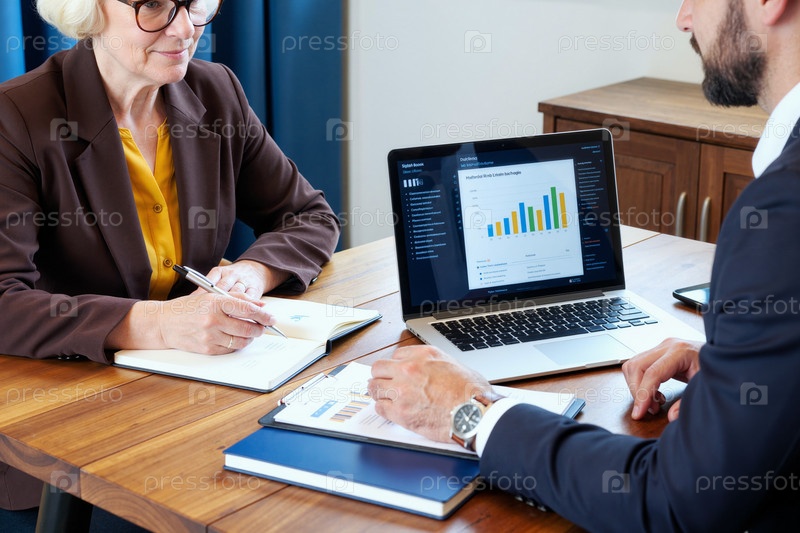 Взрослая женщина обсуждает финансовые данные с молодым мужчиной