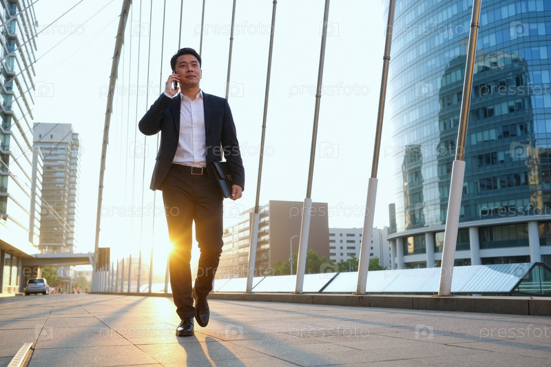 Молодой азиатский мужчина ходит на улице, разговаривает со смартфоном в городской обстановке