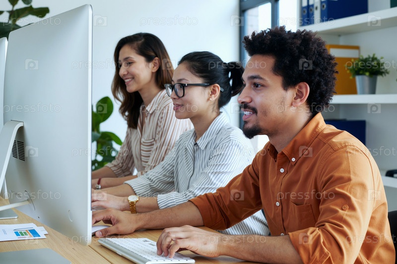 Молодые мультиэтнические коллеги сотрудничают над проектом в современном офисе