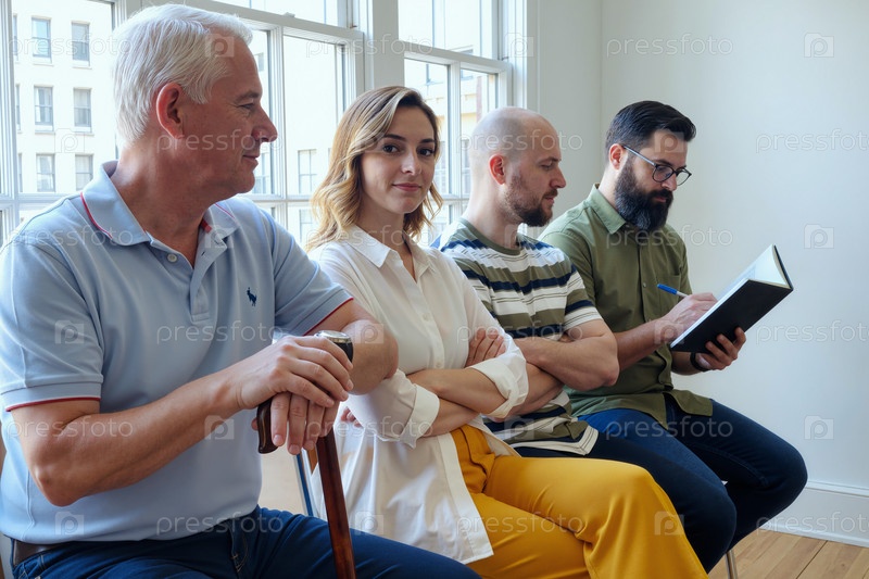 Мужчина сидит с разными молодыми людьми, сотрудничающими со взрослыми