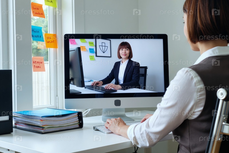 Молодая азиатская бизнесвуменка посещает онлайн-встречу с коллегой удаленно