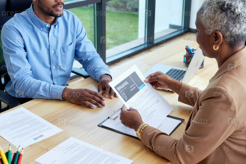 Старшая американская женщина интервьюирует молодого чернокожего человека в офисе
