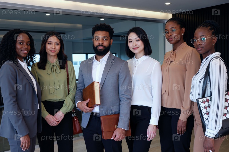 Разнообразная группа молодых профессионалов позируют вместе в современном офисе