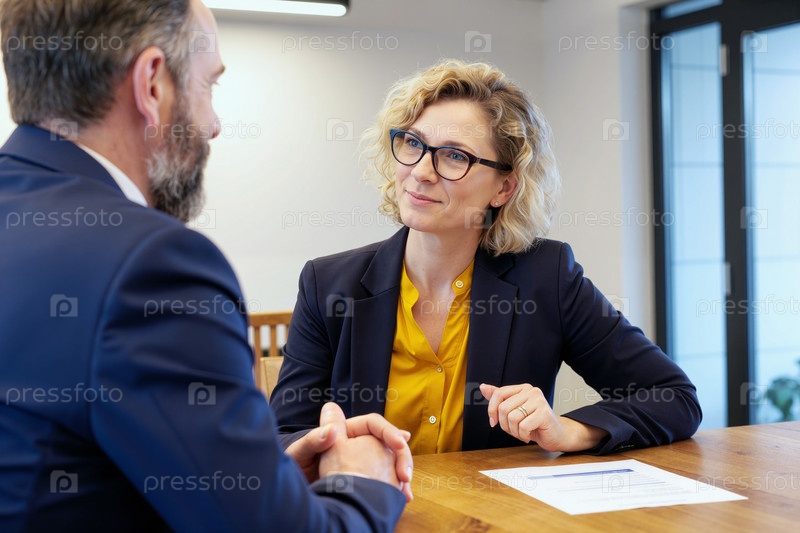 Взрослая женщина слушает коллегу во время деловой встречи