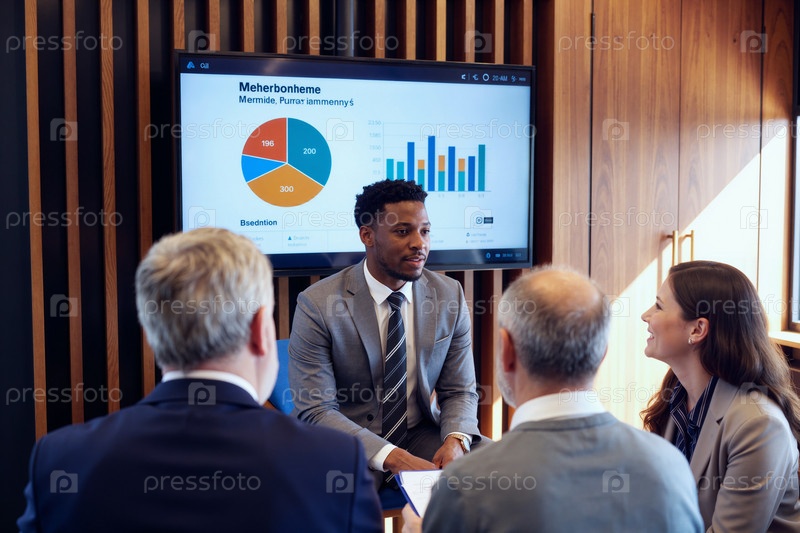 Молодой чернокожий человек, ведущий бизнес-презентацию для различных взрослых коллег