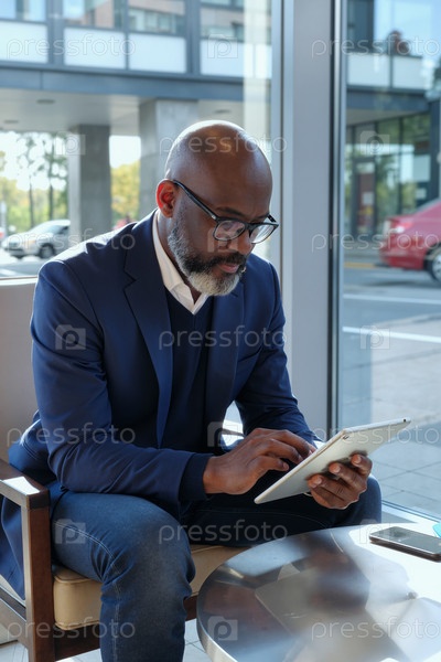 Взрослый чернокожий мужчина использует цифровой планшет, сидя возле окна
