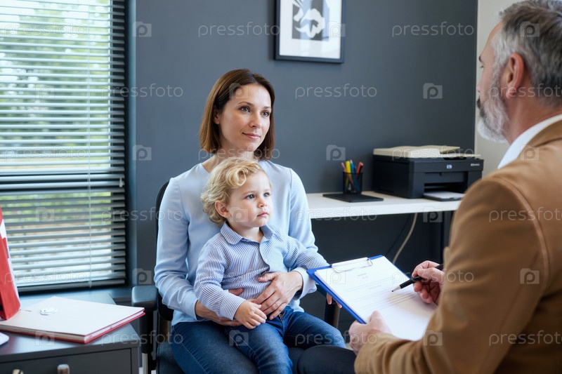 Молодая мать держит ребенка, консультируясь со взрослым мужчиной