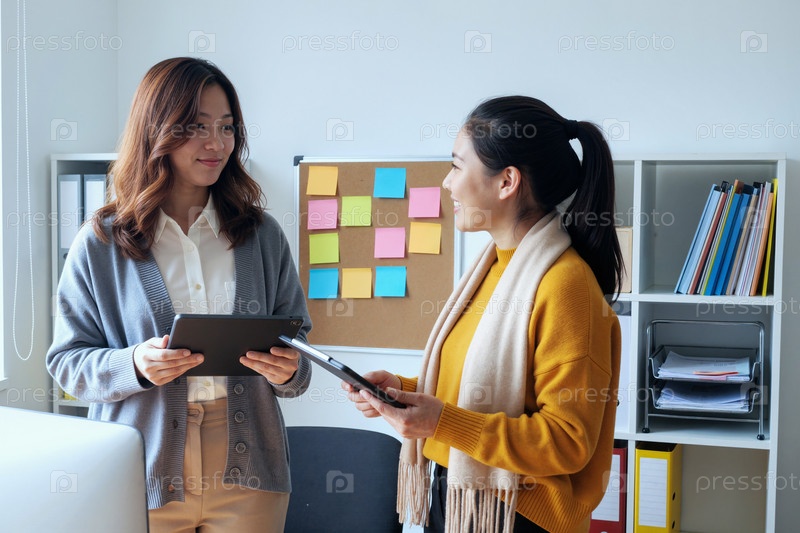 Две молодые азиатские женщины сотрудничают с помощью цифровых планшетов в офисе