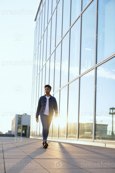 Молодой чернокожий человек ходит на открытом воздухе возле современного стеклянного здания в Сансет