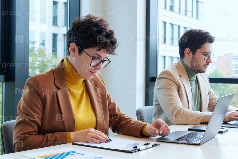 Молодая женщина анализирует финансовые графики рядом с молодым человеком, работающим