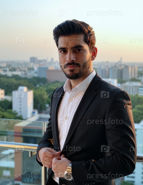 Портрет молодого человека, стоящего на балконе с видом на городской пейзаж