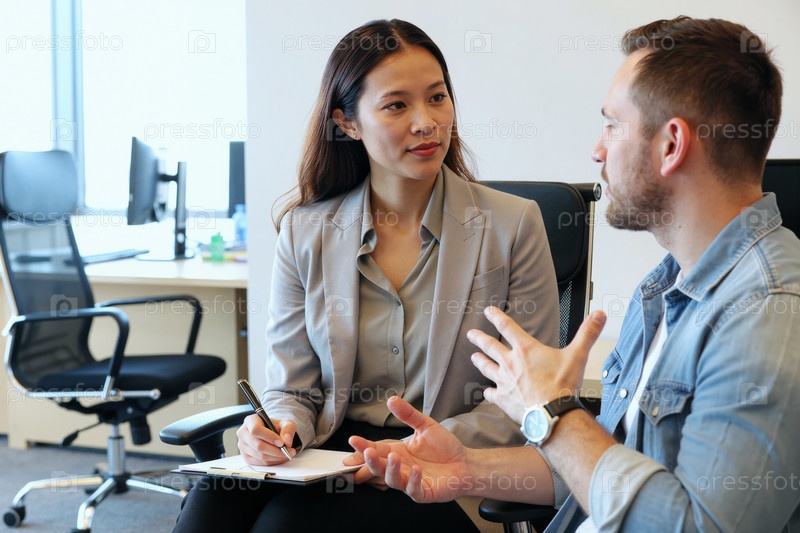 Молодой человек объясняет, пока молодая азиатская женщина делает заметки в офисе