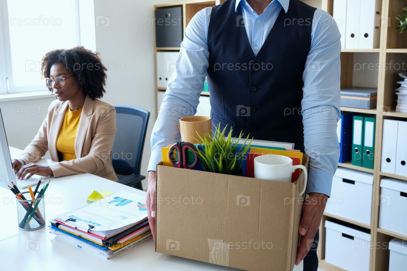 Взрослый мужчина, несущий ящик с канцелярскими принадлежностями на рабочем месте