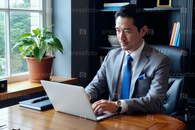 Взрослый азиатский мужчина работает на ноутбуке в современной офисной среде
