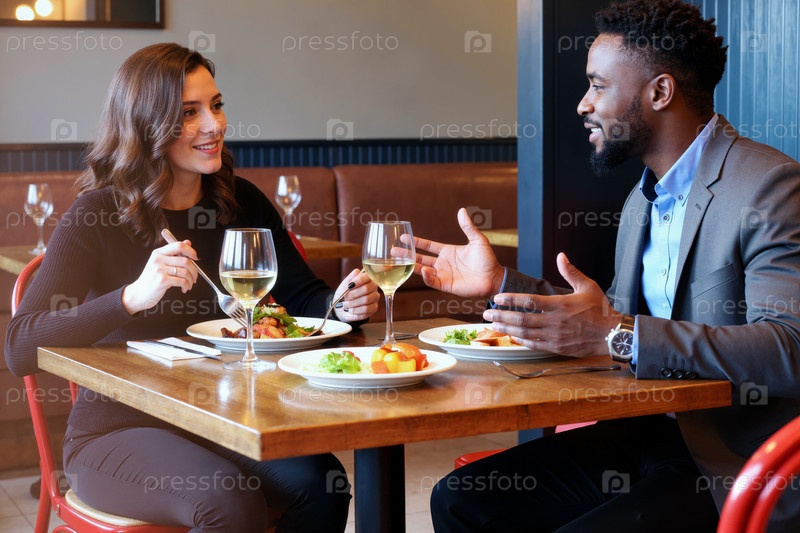 Молодая женщина и молодой чернокожий мужчина наслаждаются обеденным разговором в ресторане
