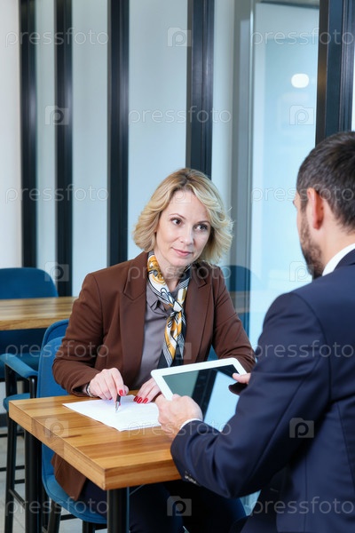 Взрослая женщина слушает бизнесмена, обсуждающего проект