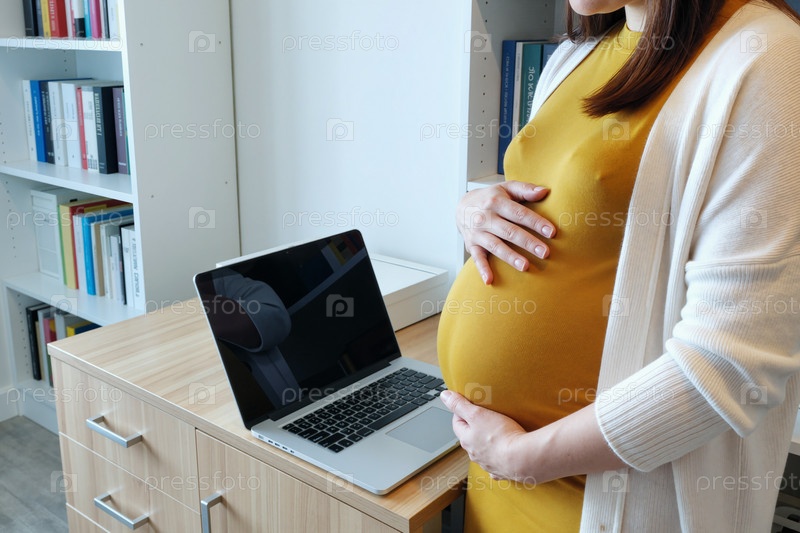Беременная молодая женщина стоит рядом с ноутбуком в офисной обстановке