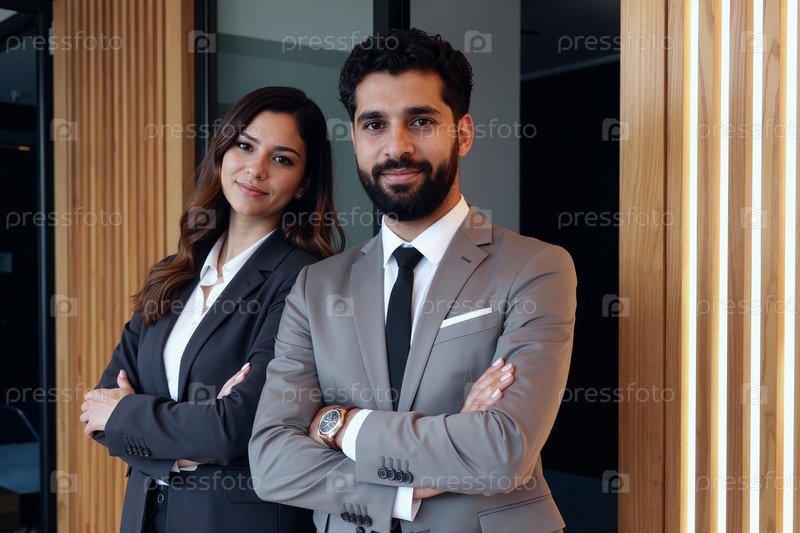Молодая женщина и мужчина с Ближнего Востока уверенно стоят в помещении