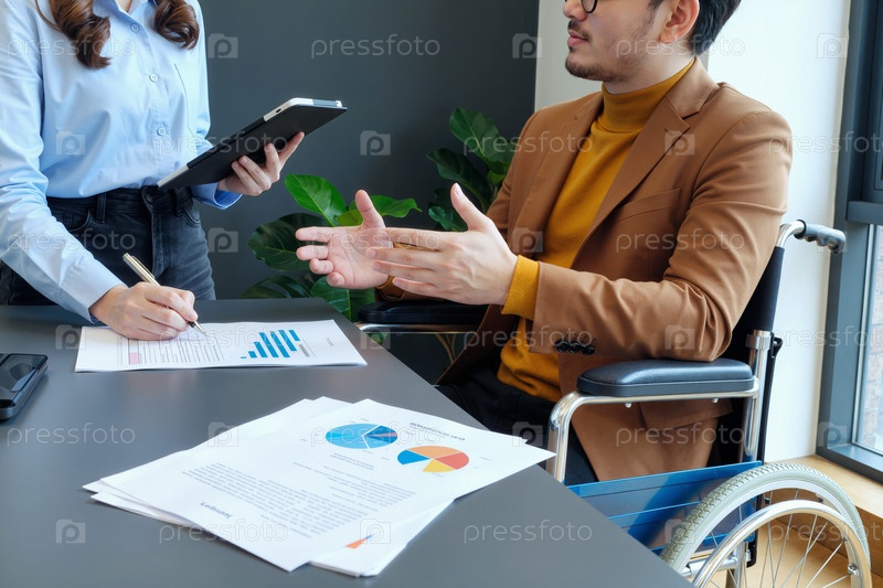 Взрослый мужчина с инвалидностью обсуждает бизнес-стратегию в помещении