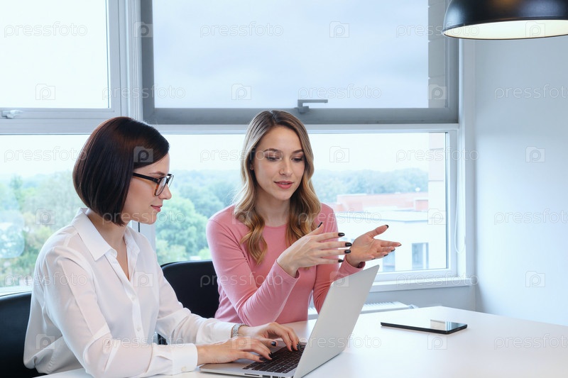 Молодые женщины, сотрудничающие в проекте с использованием ноутбука в офисной обстановке