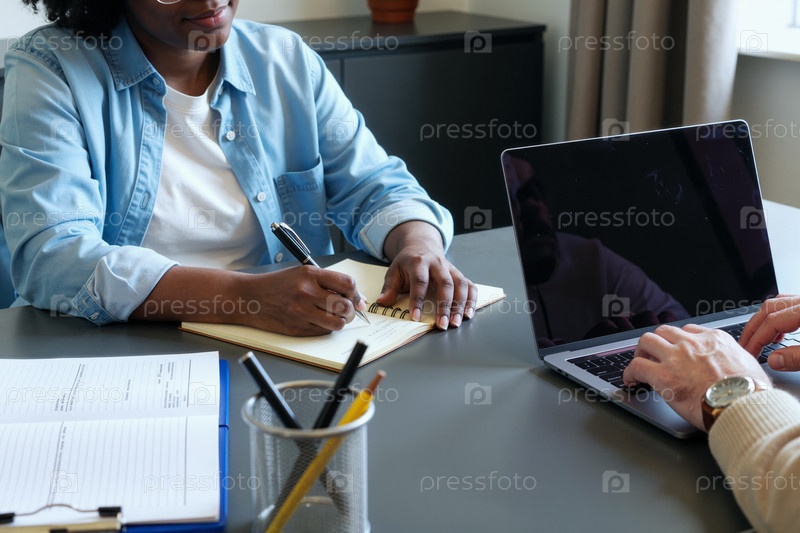 Черная женщина делает заметки, сотрудничая с молодым мужчиной