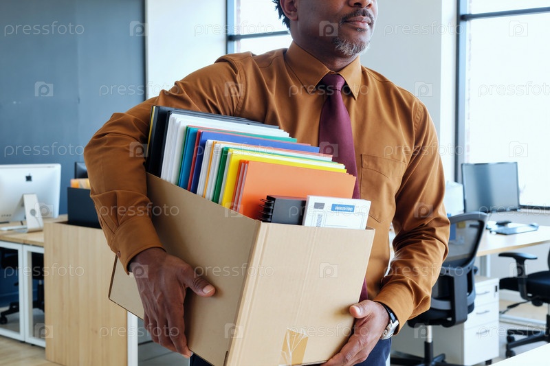 Черный мужчина несет картонную коробку, наполненную офисными документами для взрослых