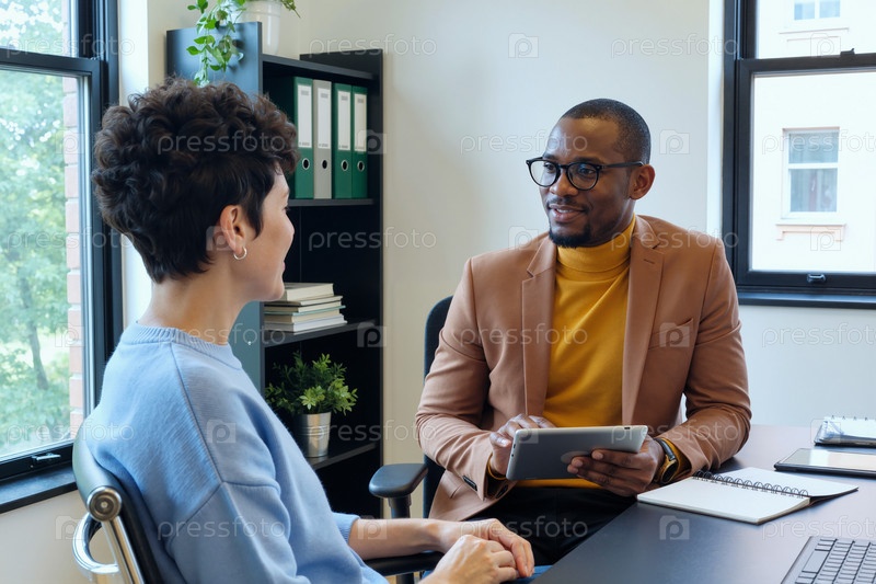 Молодая женщина консультирует молодого чернокожего мужчину, использующего цифровой планшетный офис