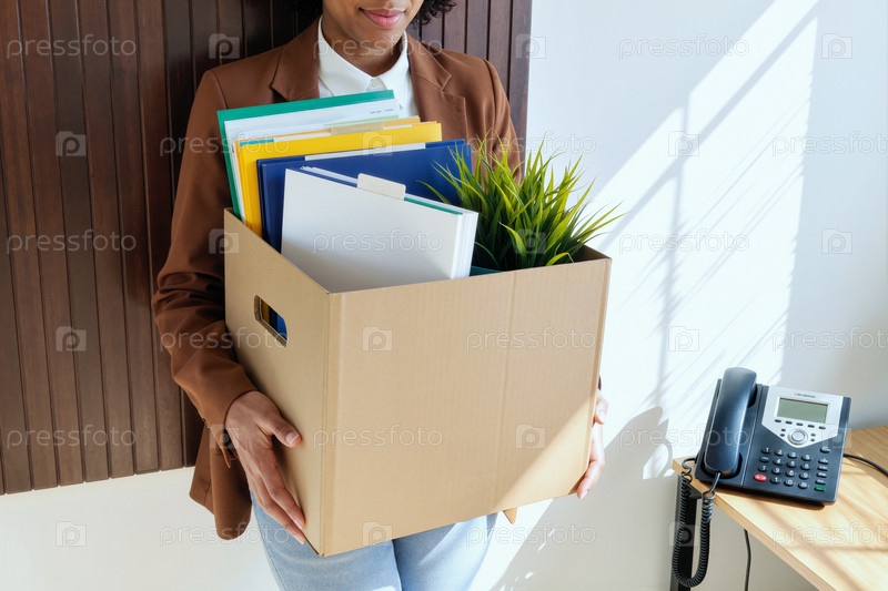Молодая женщина несет коробку с канцелярскими принадлежностями во время перехода на другую работу