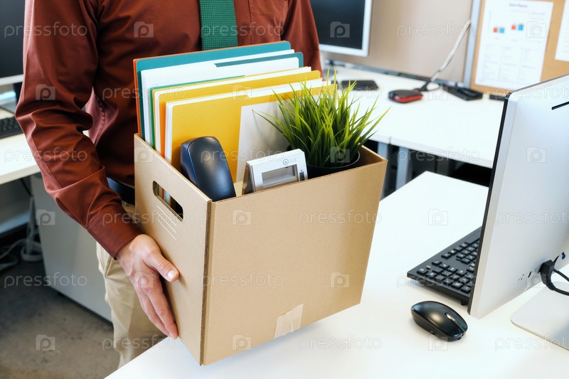 Взрослый мужчина несет канцелярские принадлежности в картонной коробке на рабочем месте