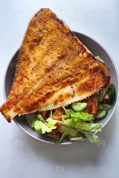 В миске лежит большой кусок жареной рыбы на свежем салате с помидорами, огурцами и листьями салата. Это полезное блюдо сервировано на простой поверхности стола