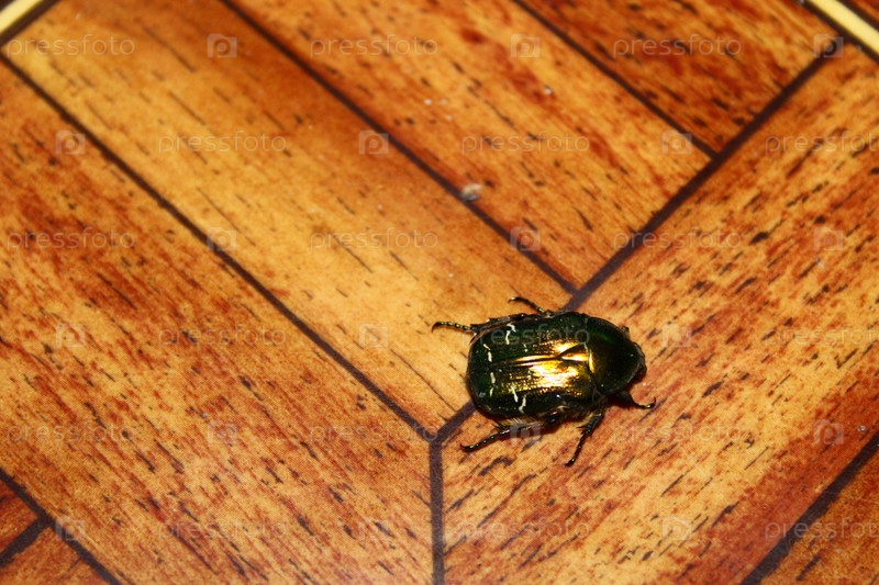 Насекомое зеленый блестящий жук, ползущий по полу в квартире, крупный план