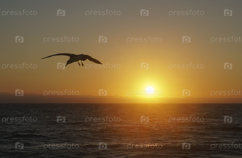Яркий морской пейзаж с закатом и чайкой над водой