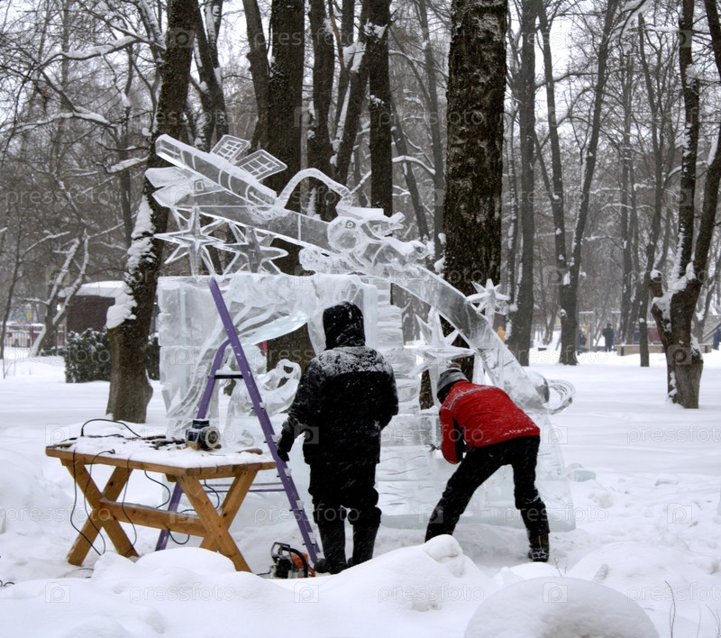 Вологда. Россия. Февраль 2026г. Фестиваль ледяных скульптур «Сердце города». Идет подготовка и создание фигур