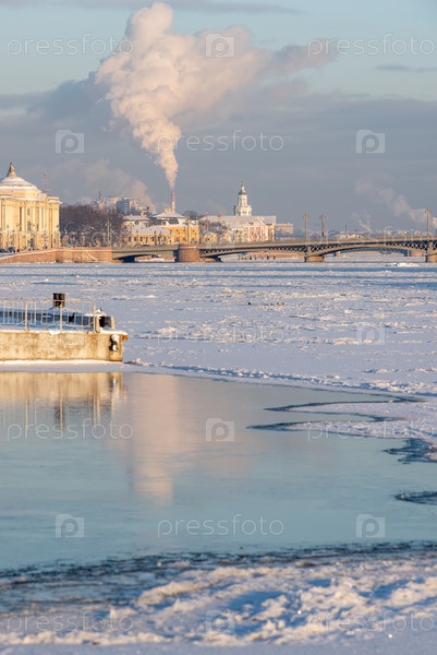 Зимний пейзаж Невы с Благовещенским мостом и паром над Васильевским островом, Санкт Петербург, Россия