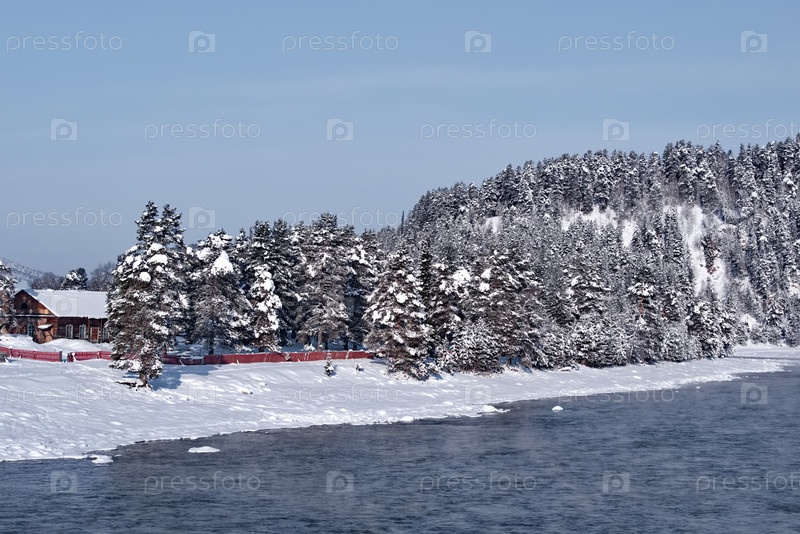 Россия. Юг Западной Сибири, горный Алтай. Живописный вид на заснеженный таежный поселок Кебезень на берегу реки Бия