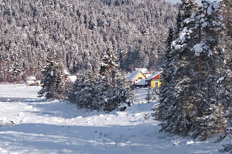 Россия. Юг Западной Сибири, горный Алтай. Живописный вид на заснеженный таежный поселок Кебезень на берегу реки Бия