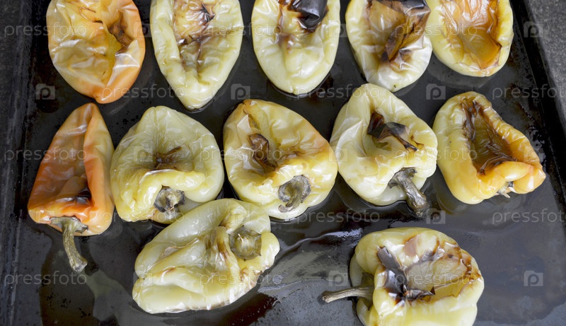запеченные перцы на черном листе. приготовление вкусной и здоровой пищи. диетический продукт. жареный перец. полезные овощи