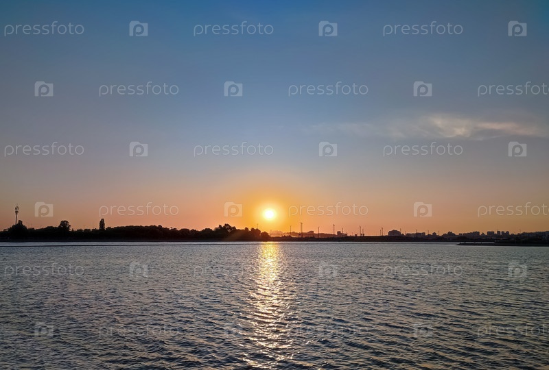 Городской пейзаж на закате над водоемом с укрепленным берегом