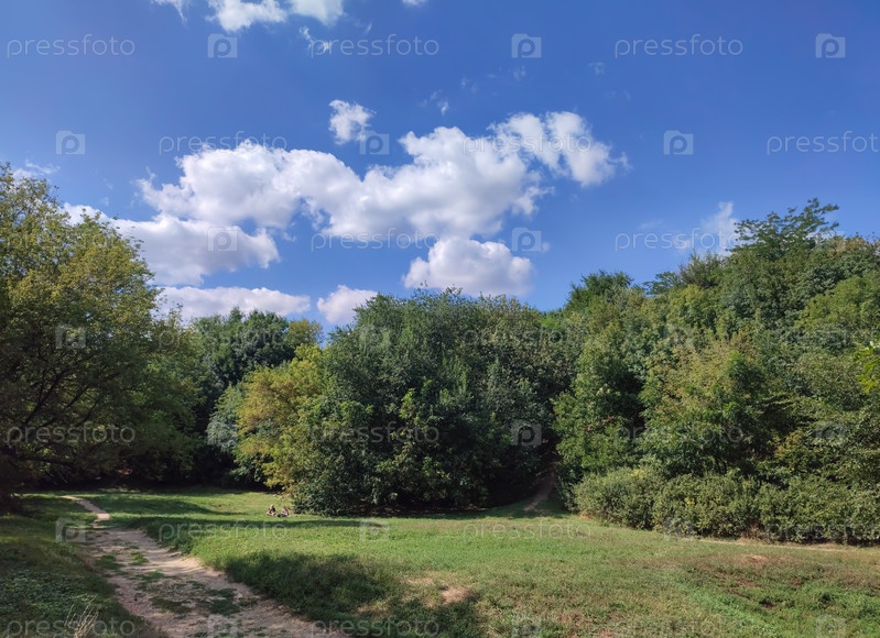 Тропинка в лесопарке среди зелени под голубым небом с облаками