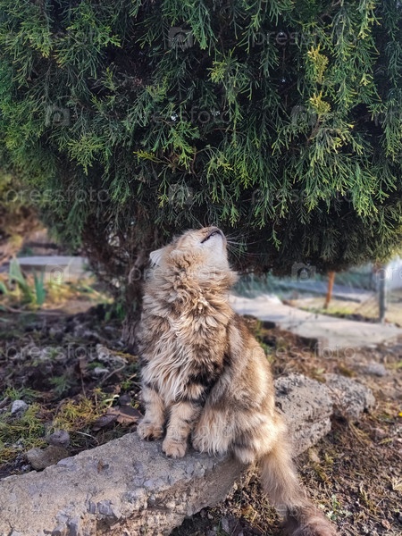 Длинношерстный полосатый кот сидит на камне у пышной зеленой туи в саду