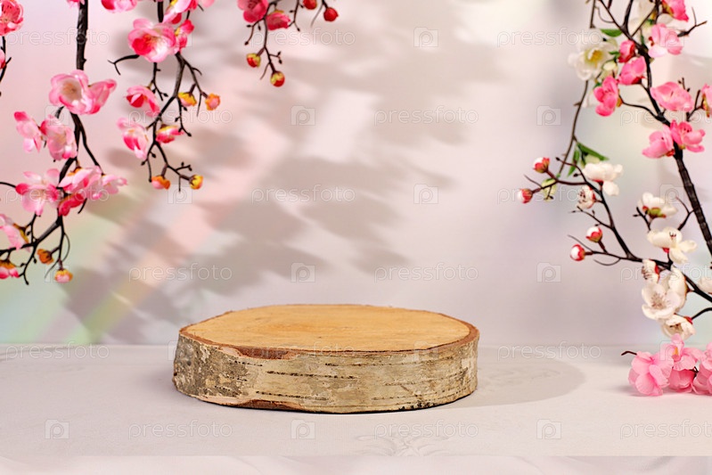 Пустой березовый подиум для демонстрации косметики, установленный на элегантном, солнечном и красочном баннере с розовыми цветами сакуры