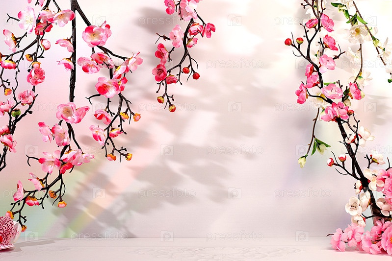 Красивый весенний стенд и шаблон для вашего творчества на красочном фоне с розовыми цветами сакуры для дизайна, Абстрактная композиция для отображения косметических продуктов, Элегантная концепция красоты