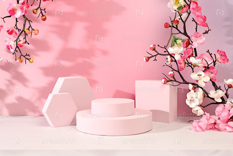 Красивый весенний стенд и шаблон для вашего творчества на красочном фоне с розовыми цветами сакуры для дизайна, Абстрактная композиция для отображения косметических продуктов, Элегантная концепция красоты
