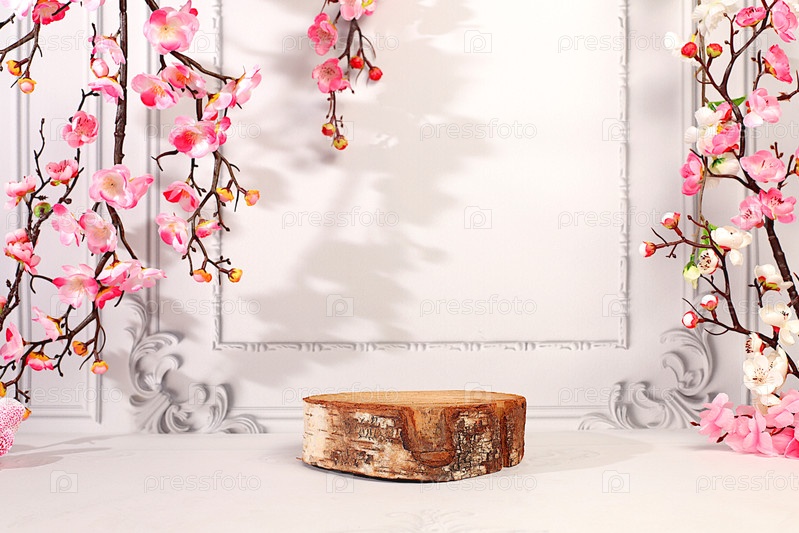 Пустой березовый подиум для демонстрации косметики, установленный на элегантном, солнечном и красочном баннере с розовыми цветами сакуры