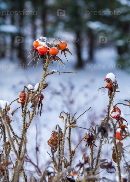 Красный зрелый шиповник в снегу на фоне зимнего пейзажа
