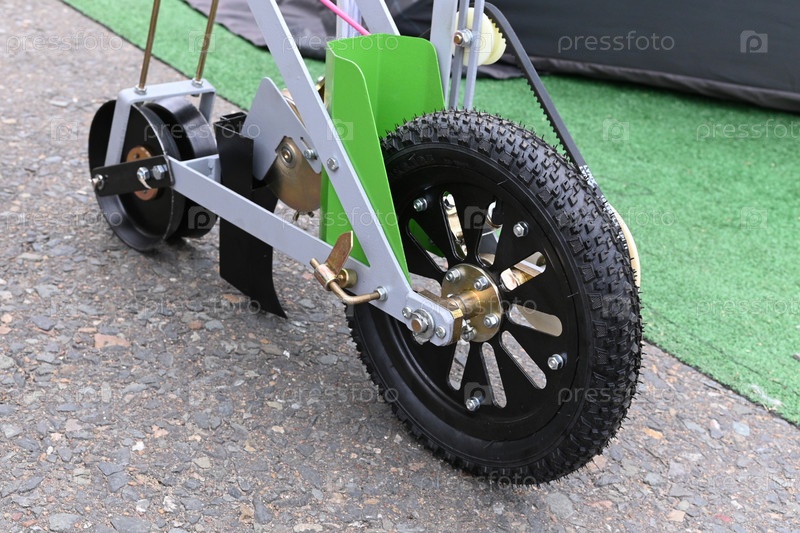 Коляска для гольфа с черным колесом припаркована на полигоне.Коляска имеет металлическую раму и зеленые акценты.Поблизости есть трава и газоны, в то время как игроки практикуют свои качели