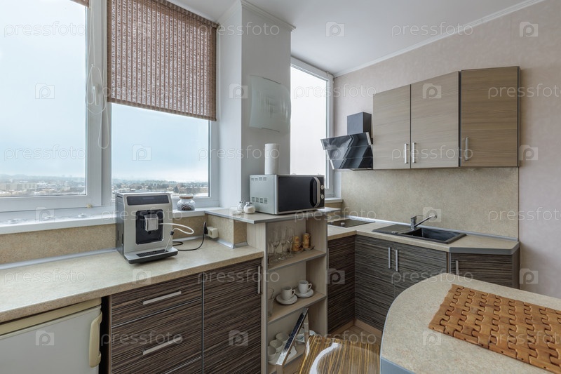 Современный уголок кухни с серыми деревянными шкафами, легкой столешницей с кофеваркой и микроволновой печью. Яркий минималистский дизайн студийной квартиры с большим окном с видом на город и функциональным кухонным принадлежностью